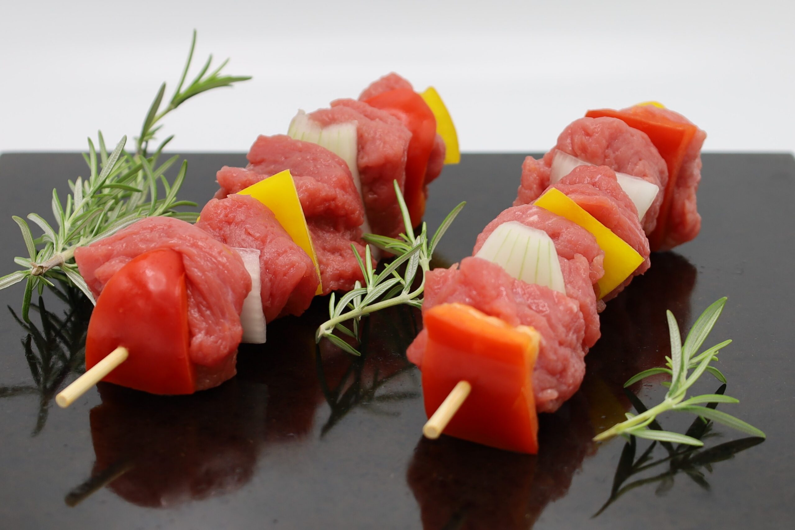 Spies met sappig rundsvlees, afgewisseld met stukjes paprika en ajuin. De natuurvariant is puur vlees, ongekruid.